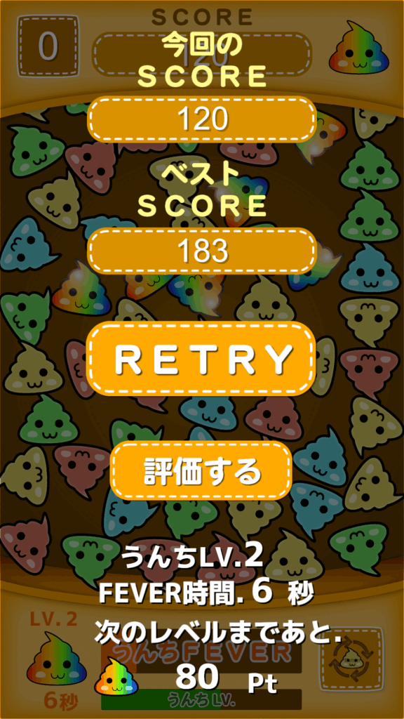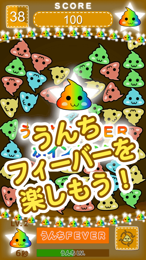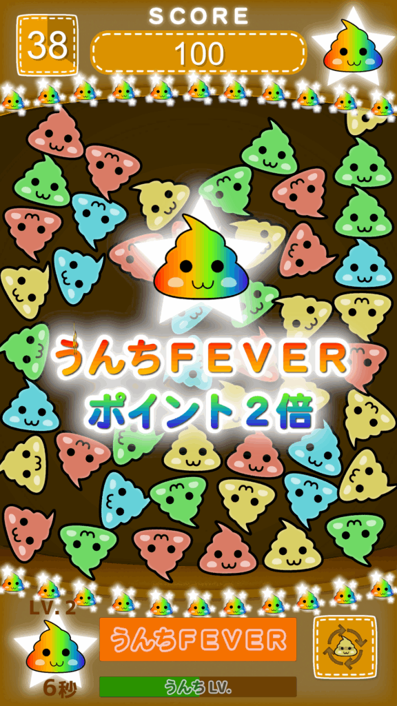 レベルが上がると、うんちFEVERの時間が長くなるよ!